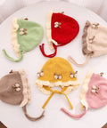 • المميزات: نسيج محبوك ناعم مضلع، حواف مكشكشة، زينة على شكل فيونكة، أربطة أسفل الذقن