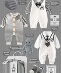 - Type B: Bow-tie jumpsuit (single layer) + plaid vest romper (double layer) + tie romper (double layer) + gray cap + socks + teddy bear + photo frame + blessing card + suitcase + handbag
