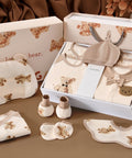 - Features: Gentle Class A cotton fabric, teddy bear theme, mix of rompers, bibs, blankets & accessories, beautifully boxed
