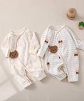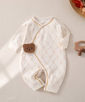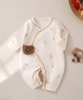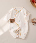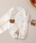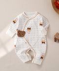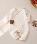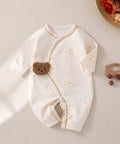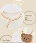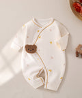 - Features: Soft cotton handfeel, wrap front closure, diaper-friendly snap legs, flat inner seams, adorable bear pocket detail
