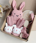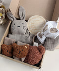 • Features: soothing animal comforter, absorbent saliva towel, soft socks with character detail, knot headband, wooden bite ring, gift-ready box presentation