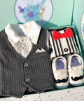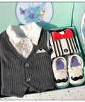- Features: Soft romper with bow tie, elegant vest design, coordinated socks and shoes, stylish presentation box