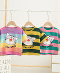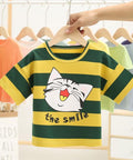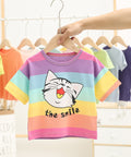 - Features: Round neck, colorful stripes, playful cat print, soft cotton, lightweight comfort