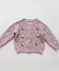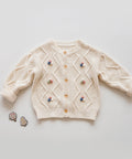 - Características: Botones de madera, tejido texturizado, bordado de pompones coloridos.