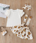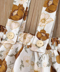- Características: Top con mangas con volantes, falda floral con tirantes, diadema a juego, cómodo algodón ligero.