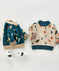 - Características: tejido de punto con patrón geométrico, puños y dobladillo acanalados, cuello redondo, textura suave cepillada, ajuste relajado.