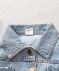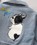 - Features: Cartoon dog back print with “Wanna Play?”, button closure, front pockets, light blue wash