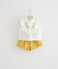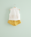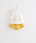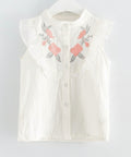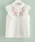 - Features: Lightweight cotton fabric, floral embroidery, ruffle collar, sleeveless top, elastic shorts