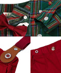 - Features: Plaid pattern, bow detail, adjustable suspenders