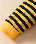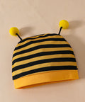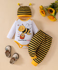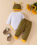 Komplet s čebeljim potiskom, črtastimi hlačami in kapo